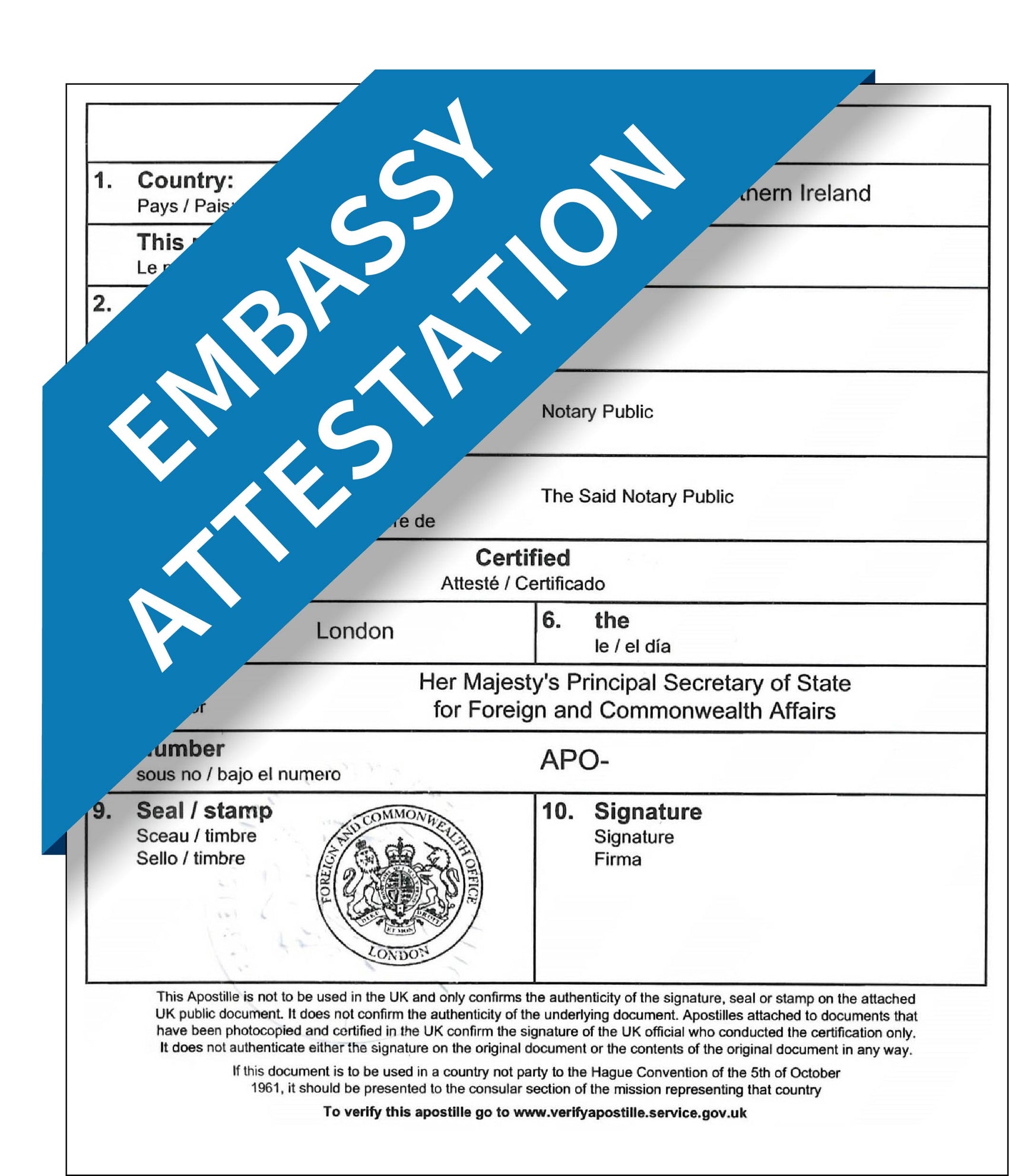 Unlike an Apostille, which applies to countries that are members of the Hague Convention, embassy attestation is required for non-Hague countries such as the UAE, Qatar, Kuwait, Saudi Arabia, and Vietnam, among others.