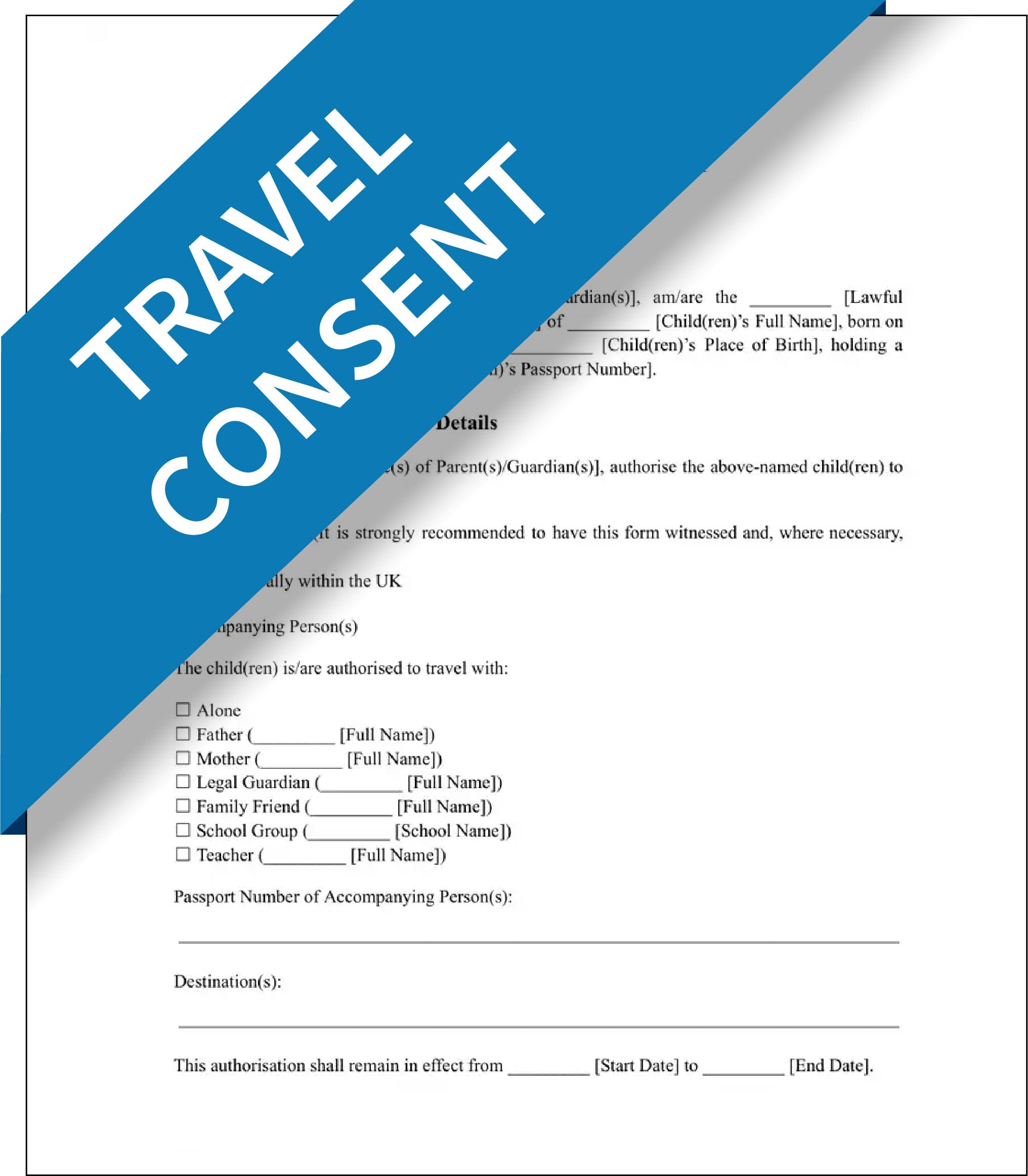 A Child Travel Consent Form must be signed in the presence of a solicitor or a notary public in the UK.